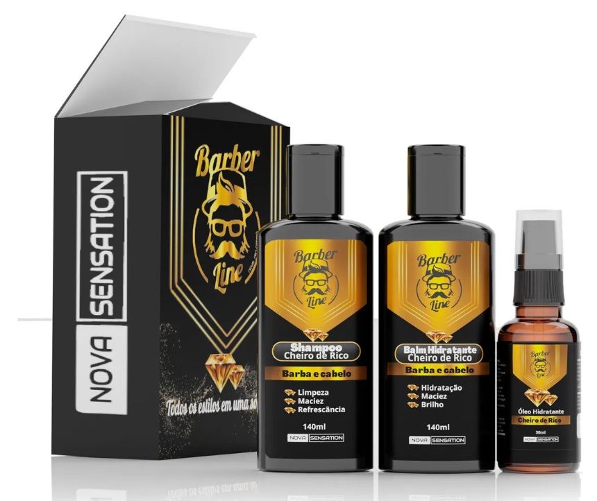 ✓ Kit para barba completo com shampoo, balm e óleo — itens essenciais para hidratação e alinhamento da barba.